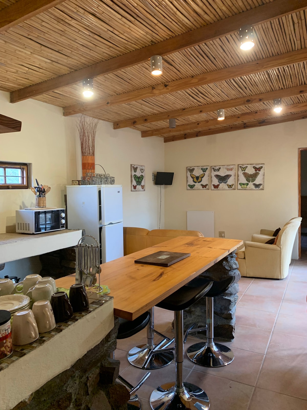 Մեր հարմարավետ ինքնասպասարկման քոթեջը գտնվում է Գաֆ - Ռեյնետից 30 կմ հեռավորության վրա գտնվող ագարակում ։ Հաստ պատերը հիանալի մեկուսիչներ են և ձմռանը տաք են պահում քոթեջը, իսկ ամռանը ՝ զով ։ Հյուրասենյակում կա երկու ննջասենյակ և երկու լրացուցիչ մեկտեղանոց մահճակալ ։ Braai հարմարությունները հասանելի են մի տախտակամած, որը նաեւ ապահովում է անհավատալի դիտարկումներ է Tandjiesberg լեռներում եւ ֆերմայի ամբարտակ ռոումինգ Springbuck. Դա իսկապես հանգստի վայր է ։ Արևայրուքները լրացուցիչ հյուրասիրություն են վաղ թռչունների համար: