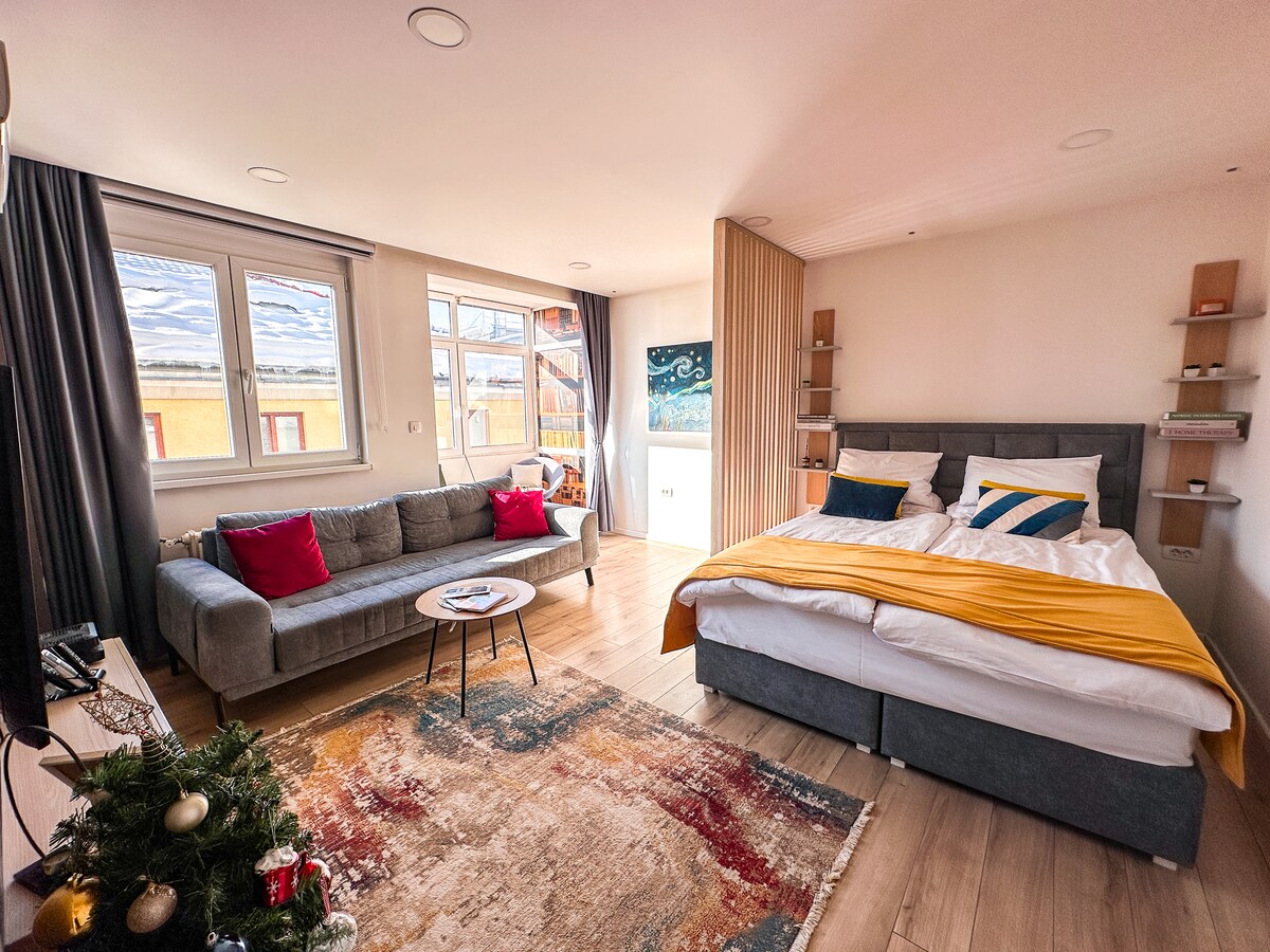 Լուսավոր, հարմարավետ և հանգիստ ստուդիո բնակարան ՝ հիանալի տեսարան