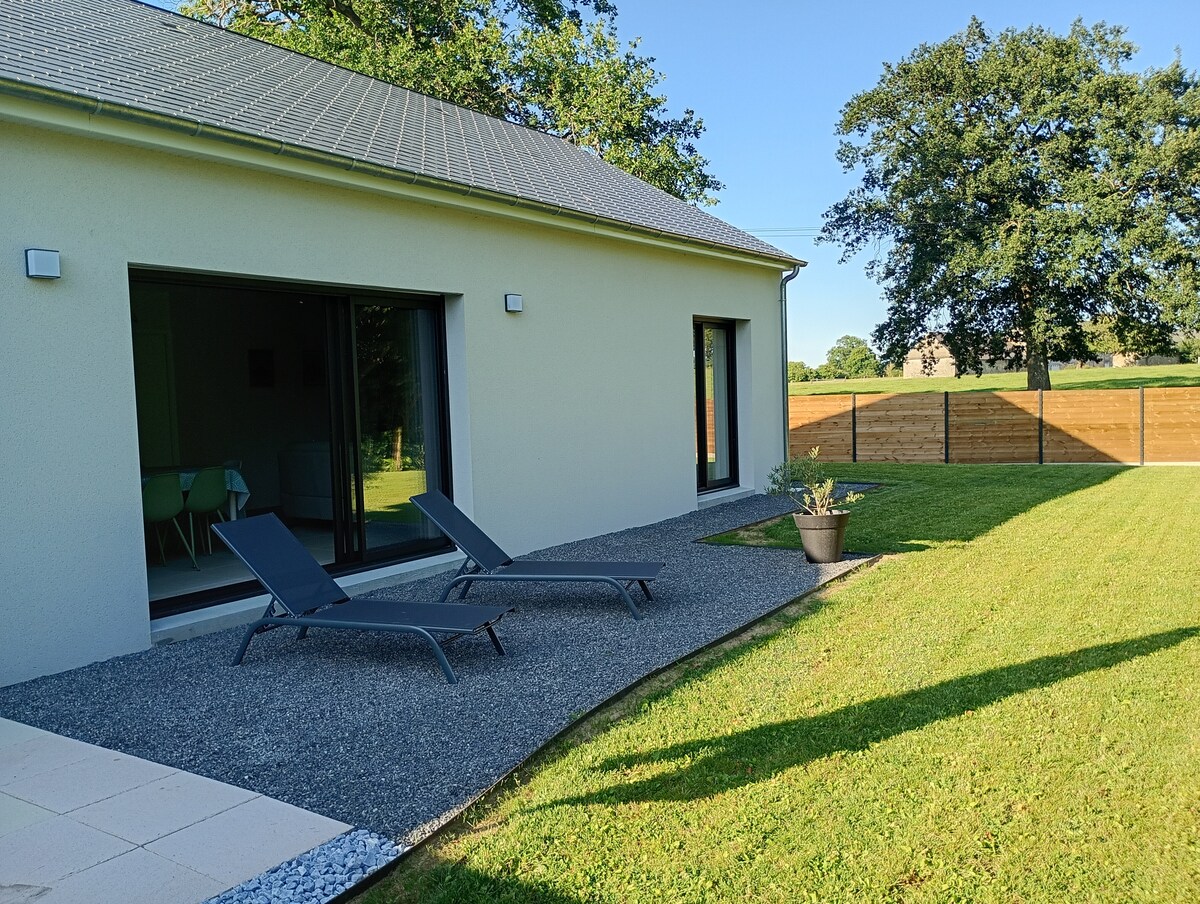 Logement neuf tout confort de 73 m² décoré avec gout, extérieur de 700 m². Dans un cadre champêtre, situé dans un petit village à 18 km de Villedieu les poeles (cité du cuivre), à 35 km du Mont Saint Michel, à 8 km des plages, à 18 km de Granville ville réputée pour son port de pêche et de plaisance, point de départ des iles Chausey Jersey, maison et jardin Louis Dior. à 11 km du zoo de Champrepus, à 7 km des commerces.