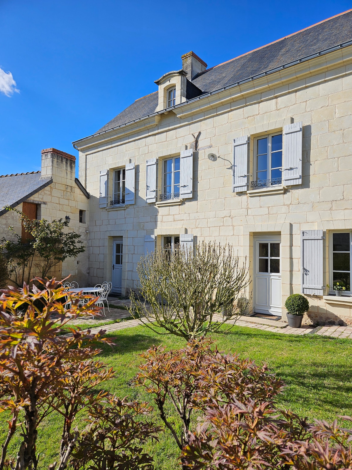 Le Grenier is a spacious luxurious gîte finished to a high standard.. Retaining many period features- fireplace and beautiful Tuffeau staircase . It adjoins our own residence but is completely self contained with its own garden front and back well equipped. Situated in a peaceful hamlet in the wine growing region of the Loire. Less than7 km from Doué la Fontaine with its famous Bio Park. 20 km from Saumur. Excellent place to explore the vineyards and Chateaux of the Loire. — 10% for couples