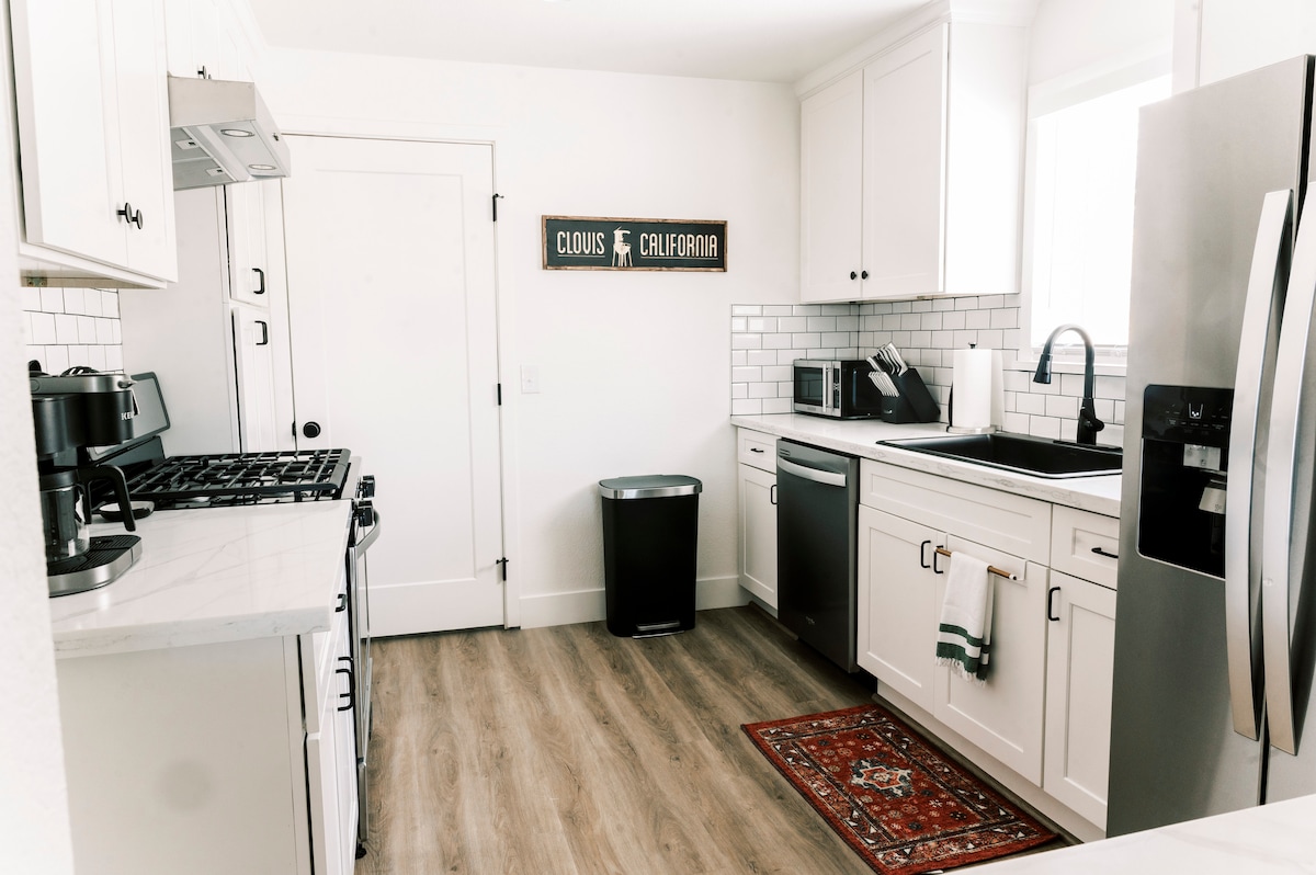 Բարի գալուստ Օլդ Թաուն Քլովիս ։ Մեր վերանորոգված տունը նորաձև և հարմարավետ է՝ բոլոր հարմարություններով, որոնք ապահովում են հանգիստ հանգիստ։ Ծանոթացեք տեղական հնաոճ իրերի խանութներին և գերժամանակակից բուտիկներին, այնուհետև կծեք կամ սուրճ խմեք մոտակայքում գտնվող մեր սիրված սննդի կետերից և սրճարաններից մեկում ։ Գերարագ Wi - Fi - ը և 2 աշխատանքային տարածքները կգնահատվեն հեռավար աշխատողների կողմից, իսկ ընտանիքները կվայելեն ընդարձակ հետնաբակը ՝ դարպասի պարիսպով և լոգարանով երեխաների լոգանքի համար: Նախքան Յոսեմիտե կամ Սեքվոյա ազգային պարկ այցելելը ։