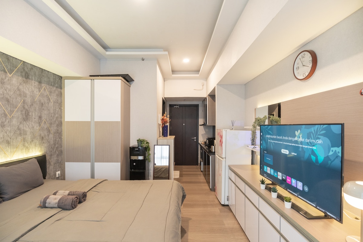 Modern Studio with Amenities & Mall Access in Depok Experience comfort and convenience in this cozy studio apartment, perfect for business or leisure. Equipped with essentials like a TV, high-speed WiFi, refrigerator, and water dispenser, it also boasts a scenic view for a relaxing stay. You can also enjoy the apartment's swimming pool. Note: albeit we DON'T provide water heater for shower, the water temperature here is generally comfortable 😊