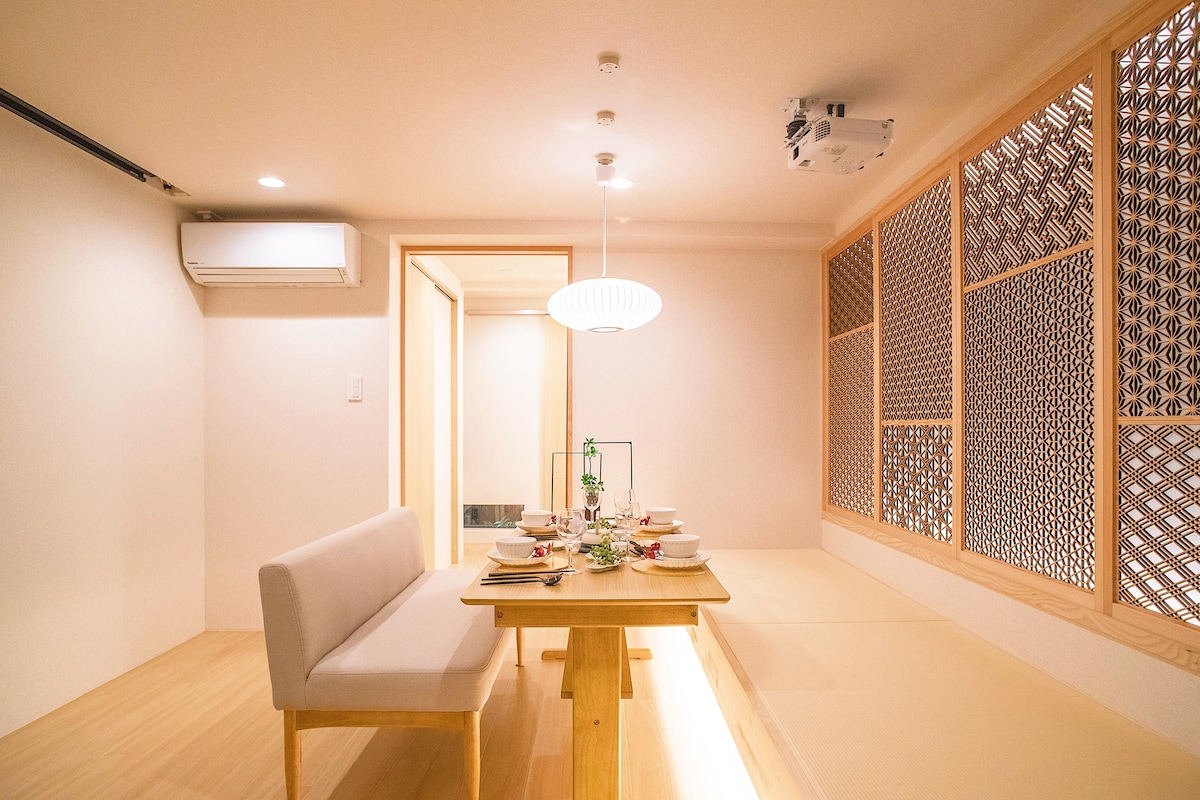 2022年8月にリニューアルオープンした一棟貸切の別荘型民泊施設です。EV付きで126㎡の広々とした客室と庭付の半露天風呂が備わっており、標準で10名の大人が泊まることができます。 かつて、住吉大社を参拝した豊臣秀吉がこの地に立ち寄り、茶店から清泉を汲んでお伴の千利休に茶を点てさせたところ、味の良さに感激したことから殿下の「殿下茶屋」、天下人の「天下茶屋」などの名が知られるようになりました。この宿は天下茶屋の地名にふさわしい『茶道』をコンセプトにして作られました。 茶道をコンセプトにしたインテリアと、日本文化を象徴する茶道体験を楽しむことができ、坪庭のある信楽焼の陶器風呂で日本酒を飲みながら豊かな気分でリラックスした時間を過ごせます。また、110インチもある大型スクリーンとプロジェクターやニンテンドースイッチ等のエンターテイメントも備えており、多人数向けに最適な宿です。まさに日本の古と今が融合した施設のしつらえが滞在の体験をドラマチックに演出します。 さらに、抜群のアクセスで関西国際空港からホテルへ、そしてホテルから通天閣や難波や梅田等へ電車一本で行き帰りが可能です。