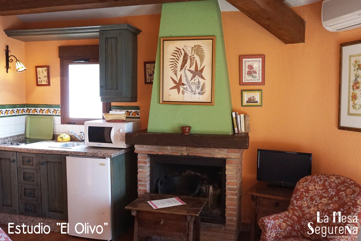Apartamento en Segura de la Sierra, en el Parque Natural de Cazorla y Segura cuenta con: Salón con chimenea con leña, aire acondicionado, TV led 32"con entrada USB. Cocina con microondas, vitrocerámica, frigorífico, lavadora, tostador, cafetera, batidora, plancha, tabla de planchar, menaje (platos, vasos, cubiertos, sartenes, ollas,..), paños de cocina y manteles. 1 Baño con secador de pelo, toallas y amenities. 1 dormitorio con cama matrimonial. Calefacción en todas las estancias. Wifi gratis.