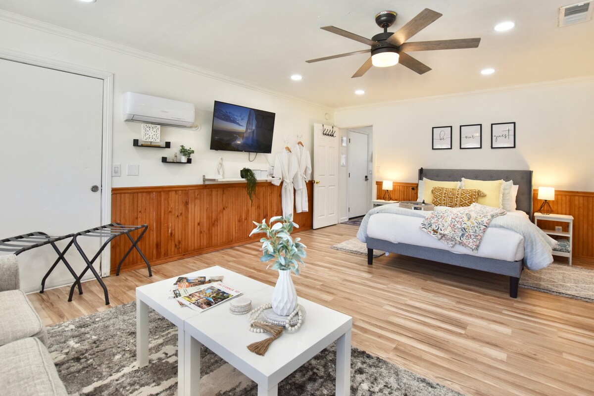 Our Casita is located 1 1/2 miles from downtown Paso Robles in a safe and quiet neighborhood. It features a private entrance, a recently renovated, clean, and spacious room for up to 2 guests. It offers a queen bed, comfortable sofa, great Wifi, smart TV, coffee bar, microwave, and refrigerator/freezer. The private bath has a walk-in shower. Parking is available on the street.
