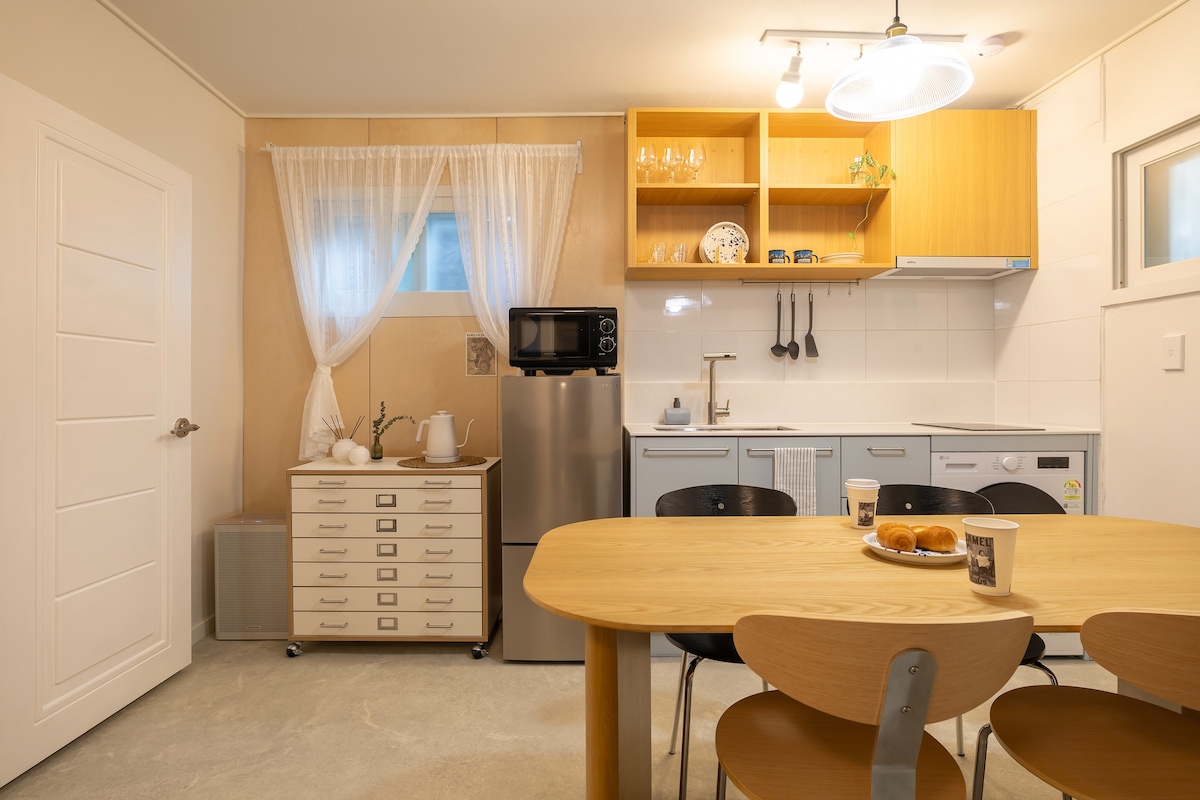 [J HOUSE] Պանորամիկ տեսարան գետի վրա/Հյուրանոցային անկողնային պարագաներ/Հապջոնգ կայարանից 2 րոպե, Հոնդե կայարանից 10 րոպե։