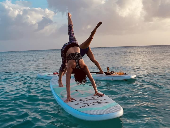 Լողացեք Lady Bird Lake - ի վրա ՝ թիավարման վահանակների վրա, և զբաղվեք յոգայի հեշտ, զվարճալի կեցվածքներով ՝ բարձրացնելով հավասարակշռությունն ու ուժը ։