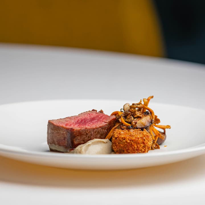 Cacio Cavallo cheese crespella with Sicilian scottona tartare, Etna Porcini սնկով, կափարիչով մրգերով և սխտորով ծիլերով