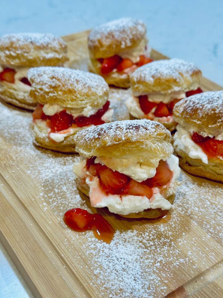 Փափուկ փքաբլիթ, որը լցված է հարած սերուցքով և թարմ ելակով ։ Յուրաքանչյուր 2 -3 հոգու համար ՝ 6 սերուցքային փքաբլիթ ։