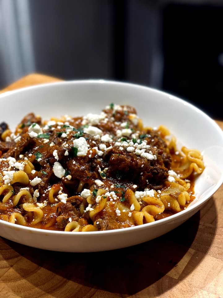 Անուշաբույր խոտաբույսերով և բանջարեղենով թրջված, թավշյա կարմիր գինու սոուսով ։ Պատրաստված է մակարոնեղենով ։