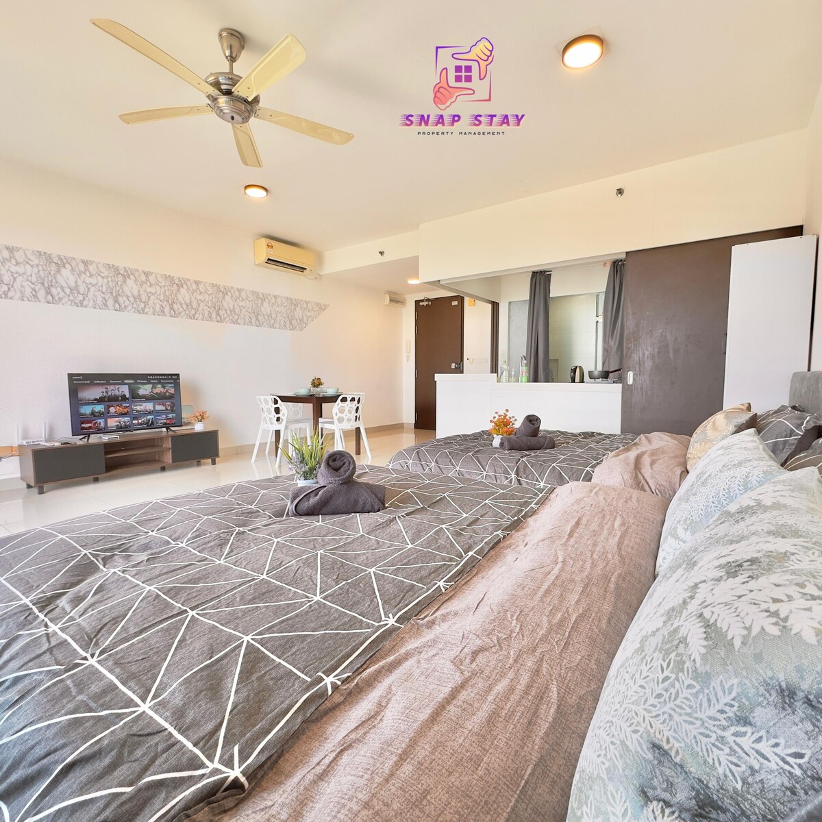 A Muji-style studio, bathroom apartment with King Size double beds. Suitable for 1-2 guests. The bathroom provides hot and cold water for a relaxing shower experience. Facilities include: Pots, pans, utensils. Water Dispenser Body wash, shampoo, hand wash, laundry liquid, and fabric softener Refrigerator, microwave, kettle, rice cooker, washer/dryer 55" SMART TV with NETFLIX, hairdryer, iron, and ironing board Water filter Free high-speed Wi-Fi (500 Mbps) 1 parking space