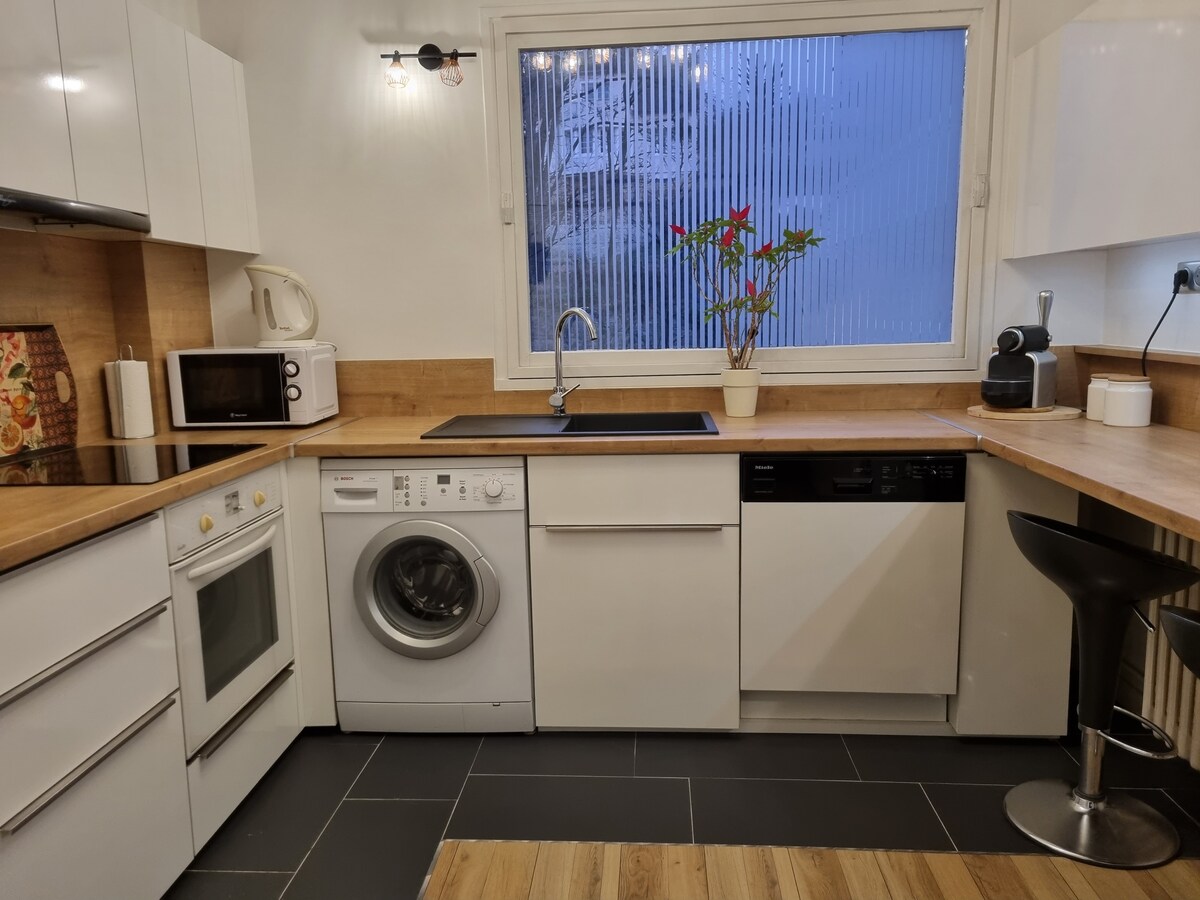Բարի գալուստ այս ընդարձակ 2 սենյականոց 52 մ2 մակերեսով բնակարան, որտեղ ամեն ինչ նախատեսված է ձեր հարմարավետության համար: 100% բամբակյա անկողնային պարագաներ և սրբիչներ ՝ օպտիմալ հարմարավետության համար Երկտեղանի թախտ (140x200) հյուրասենյակում Մեծ երկտեղանի մահճակալ (160x200) հանգիստ գիշերների համար Առկա է մանկական օրորոց Մարմնի լվացում և շամպուն 95% բնական արտադրանք է տրամադրվում Լիովին կահավորված և կահավորված խոհանոց Կայանատեղիում (անվճար) Թույլ տվեք ձեզ հրապուրել Փարիզի ծայրամասում գտնվող այս հարմարավետ և հյուրընկալ կոկոնով: