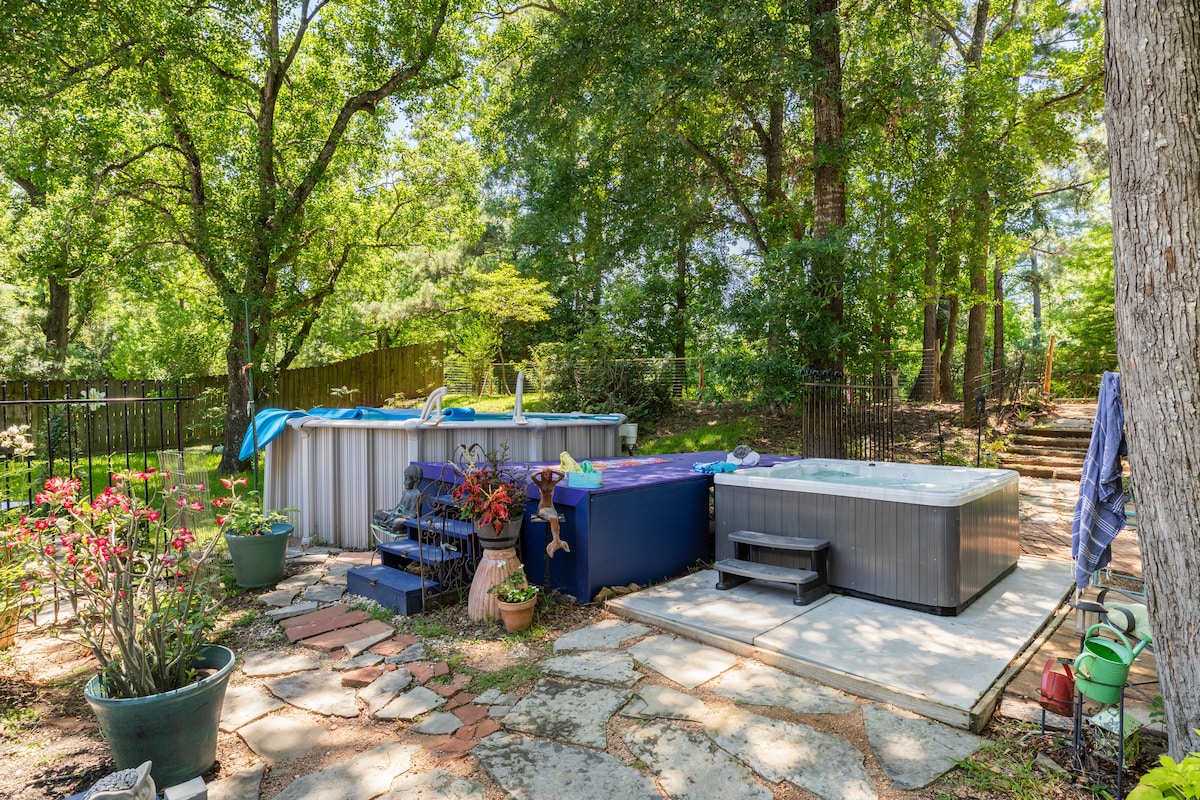 Relax and enjoy the calm serene of a country vibe feel in the middle of the city! This cozy tiny house feels like a gentle hug. Float around the seasonal splash pool, soak in the hot tub, enjoy a small container fire, or sit by the lake and watch the fish. Bring your fishing pole for catch and release stocked pond in this small vintage fishing community. Unit is on the back of the main house. Main house has area on the other side that you can’t see.