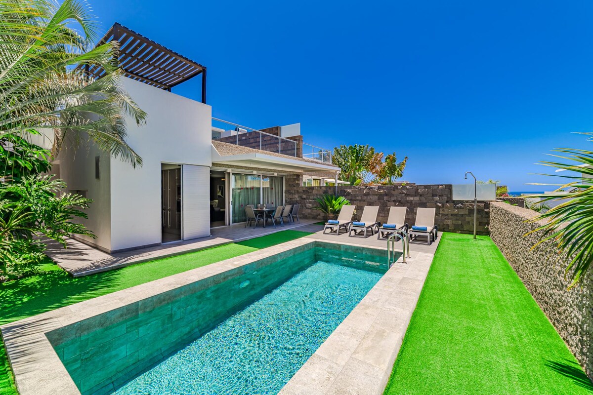 Espectacular villa en prestigiosa zona del sur de Tenerifė - Caldera Del Rey. Está a 200m de parque acuático N1 del mundo nombrado por TripAdvisor años consecutivos - SIAM PARK. A 300m está el mayor centro comercial del sur - SIAM MALL. Impresionantes vistas al centro turístico- Playa de Las Americas, las playas de lo cual están a 1.4 km. Diferentes zonas de descanso, toma del sol, desayunos, cenas en espacios únicos pensados al detalle. Jardín tropical con pérgola que da sombra todo el día y agrade con su frescura y colorido. Piscina infinity que une sus aguas con el horizonte de océano. Las puestas del sol es un espectáculo de colores, imagen que cambia cada día, pero nunca deja indiferente. Amplio salón unido con cocina americana con vistas al mar. Todos dormitorios tienen su salida independiente al jardín mejorando la privacidad de cada uno. Cada rincón de la Villa despierta los mejores sensaciones y acoge para que disfrute al máximo de sus vacaciones.