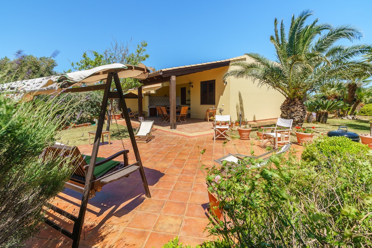 Villa indipendente all'interno di un residence distante circa 1,5Km dal paese e dalla spiaggia. Punto di forza il giardino mediterraneo, grande, esclusivo e attrezzato di tutto. Due grandi terrazze. Cucina e doccia esterna. Si gode di uno splendido panorama su monte Cofano, Erice e le Egadi. La casa e' dotata di tutti i confort. Ci sono due stanze da letto: una matrimoniale e una con due letti singoli, un soggiorno con divano letto e smart TV, aria condizionata, Wifi, dondolo e BBQ.