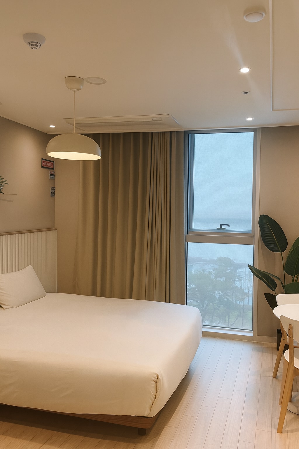 서울에서 가까운 인천 서해 바다의 너른 풍경, 빠듯한 일상 속 잠시 쉼이 필요할 때 놀러오세요 :) 깨끗하게 관리하고 있습니다. 바다와 초록 공원이 내려다보이는 야외 테라스 통유리창으로 바라보는 시원한 오션뷰, 쾌적한 레지던스 복층 원룸 숙소 ▪️인천공항 자동차 15-20분 ▪️인스파이어, 파라다이스, 을왕리 해수욕장 등 주요 관광지 자동차 25-30분 ▪️구읍뱃터 선착장 2km 자동차 5-7분 ▪️상가 중심 지구, 도보 5분 이내 식당, 카페. 건물 1층 편의점 ▪️넷플릭스 ▪️기준 2인-최대 4인 (2인 초과 시, 추가 비용 있음) ▪️이용시간 - 체크인 : 오후 4시 - 체크아웃 : 오전 11시 *얼리체크인/레이트체크아웃은 추가 비용 및 스케줄 조율이 필요하니 사전문의 부탁드립니다. ▪️반려동물 동반 불가 ▪️실내 흡연 절대 금지 ▪️삼겹살 바베큐 불가, 고기/생선/새우 굽기 불가 ▪️주차(1대 무료) - 건물 B1~B4 /주차장-숙소 연결 (2대 이상 추가 비용)