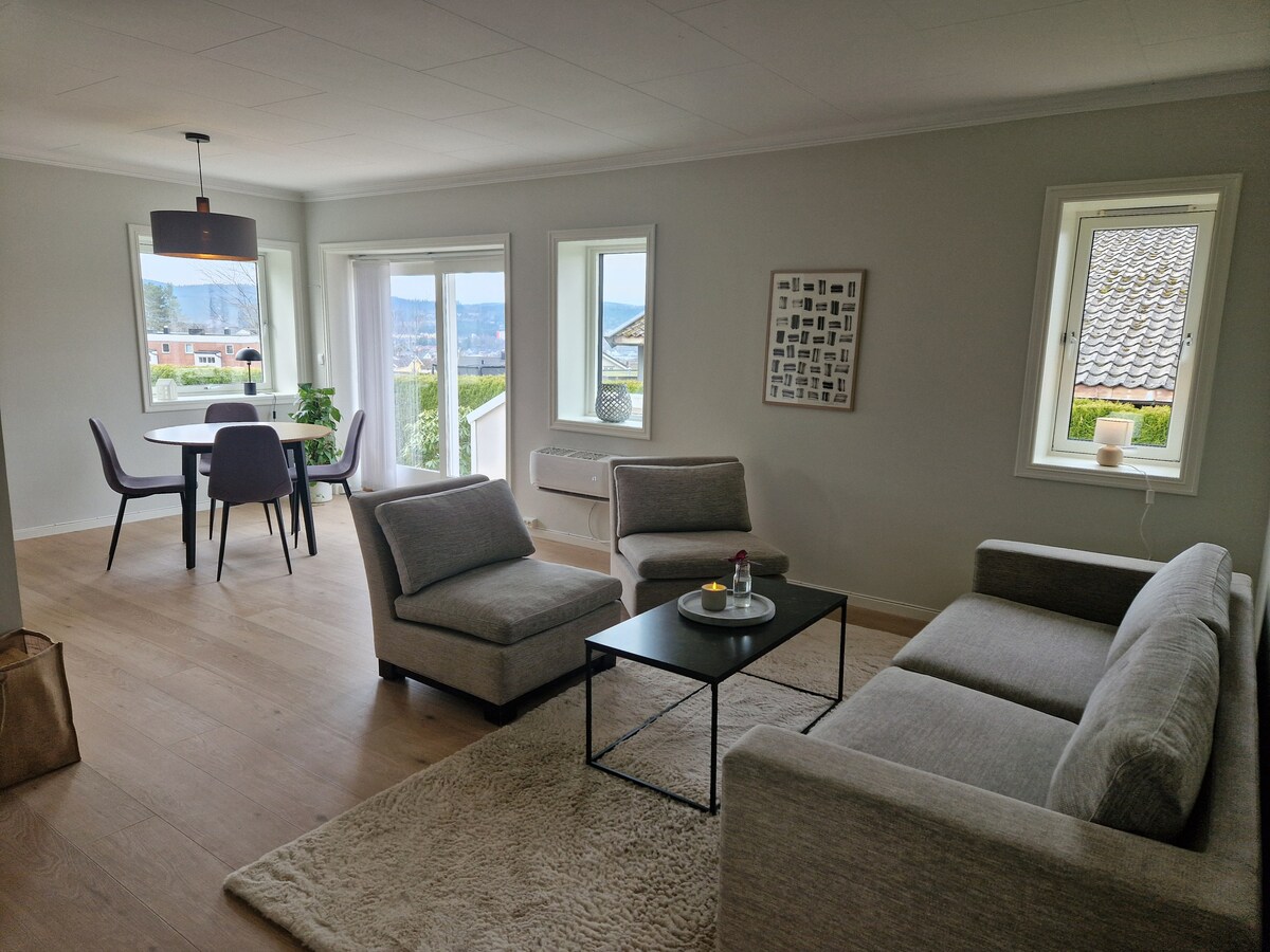 Sjarmerende og landlig leilighet med fantastisk utsikt. Et fredelig overnattingssted med sentral beliggenhet og buss rett ved. Gratis parkering for flere biler og garasje.