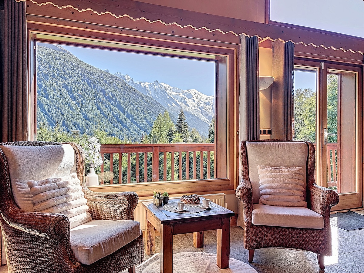 Modern 68 m² ground-floor apartment in a detached chalet, sleeping up to 6 in a quiet location. It has a fully equipped kitchen, open-plan living/dining area, smart TV, fibre-optic internet, and two bathrooms (one en-suite). The spacious east-facing entrance offers stunning views of the Mont Blanc Massif, including the Aiguille du Midi and Les Drus. Outside, a small private deck with table and chairs opens to an unfenced garden.