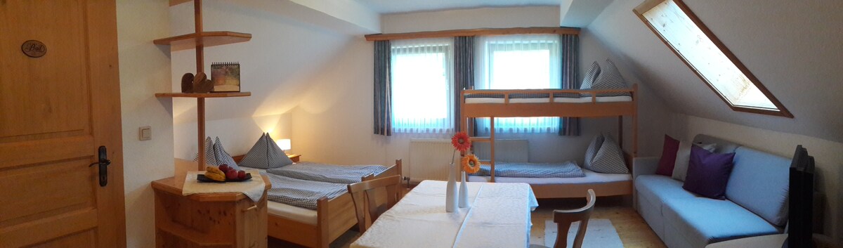 Ferienwohnung im Nebengebäude auf 2 Etagen. Eigener Eingang, Vorraum mit Garderobe und Sauna. Offenes Dachgeschoss mit Küche, Wohn- und Essbereich. In einer Nische ist ein Doppelbett(im Wohnraum) Chillen, Kamin, Fernseher! Terrasse: Sitzgruppe, Sonnenschirm, Gasgrill und Ausblick. +Schlafzimmer - Doppelbett, auf Wunsch Kinderbett. Badezimmer, Badewanne u. Dusche. Badeplatz 20m am Fluss - wenn der Wasserstand es zulässt. Loipe am Haus 15min Skigebiet, 5 See Wandern