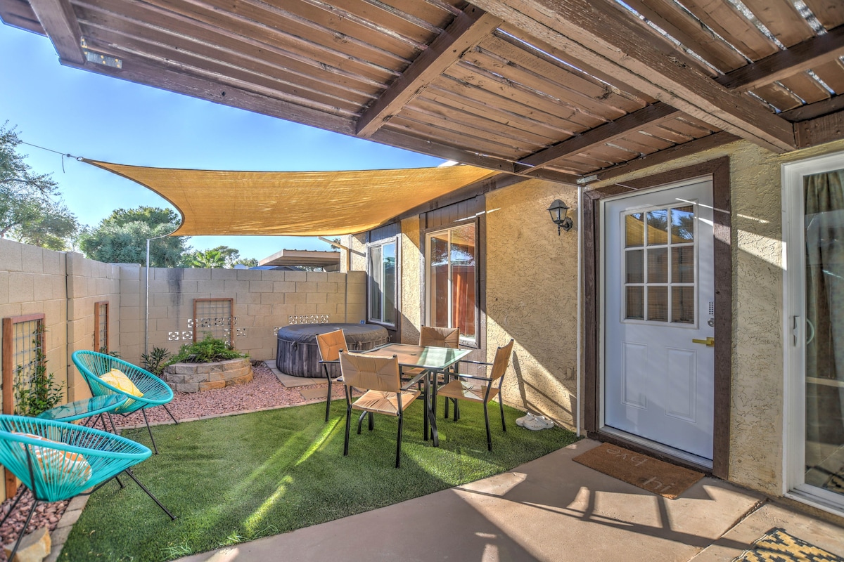Take a funky trip back in time to the DISCO DEN... INSIDE --> Out-of-sight remodel from top to bottom! 1970's vibe, complete with a Disco Ball, Atari games, and of course some Neon-but no sacrifice to the comforts of home! Plus super-fast Google Wifi! OUTSIDE --> Relax in the private hot tub, dine on the patio, or BBQ with friends+family! Or cool off in the beautiful community pool! AROUND --> Can't beat this location, corner of Scottsdale/Tempe/Mesa. 2 blocks to Riverview and Sloan Park!