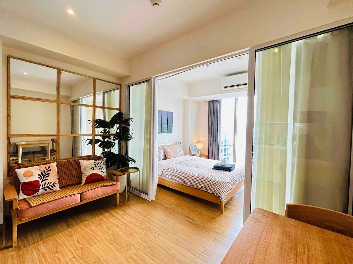 A fully-furnished, Ig-worthy, cozy and stylish 34sqm, 2-BR condo corner unit with an awesome balcony where you can relax, celebrate important events or just have a quick get-away with your family or friends and enjoy unique, world-class amenities like the wave pool, man-made white beach, children's playground, basketball court, gym, volleyball court, beach bar, sky garden and many more. It is just a 5-minute walk from a shopping mall (SM Bicutan) and only 10-15 minutes away from NAIA Airport.