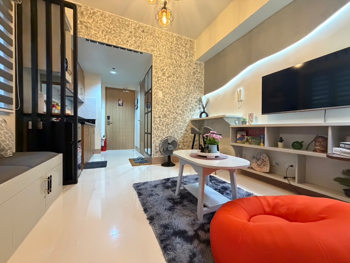 Book this luxury stay at the center of BGC. Everything is just a few steps away. Prime offices and high end malls surround The Infinity. Experience a cosmopolitan getaway. Explore unique food and shopping finds. Party the night away at premier bars right within the area. Unwind in our mid-century modern bedroom unit with a queen sized bed and a 50” smart tv. Enjoy your fave movie on a 65” smart tv in the living area. 400 MBPS internet provided for your work from home or surfing.
