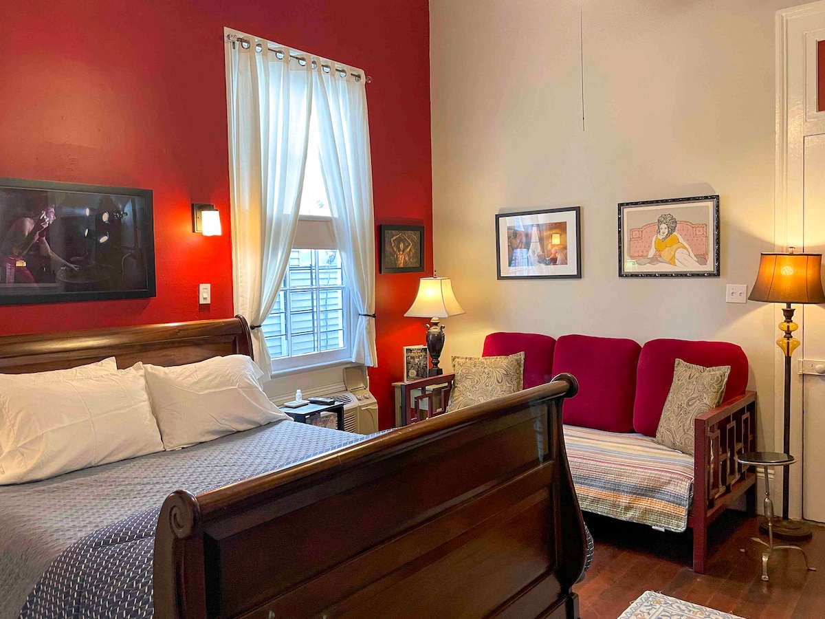 Step into New Orleans history at the Bolden Guest House, named after jazz pioneer Buddy Bolden. Located at Louis Park Hotel in Treme, this guest house features exposed brick, a king bed, and a queen sleeper sofa. The full bathroom includes a walk-in shower, bathtub, and Nexxus toiletries. Relax on the shared porch or enjoy the tranquil courtyard in this secure, gated compound. Steps from Armstrong Park and the French Quarter, it’s perfect for couples or small groups seeking comfort and charm.