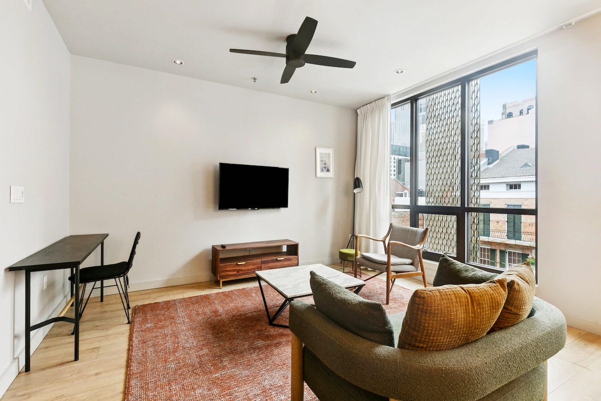 Լիովին կահավորված, շքեղ կոնդոմինիում CBD - ի եզրին, որը գտնվում է շատ բարձրակարգ, անվտանգ և ապահով շենքի 5 - րդ հարկում ՝ անմիջապես քաղաքի կենտրոնում և I -10 - ի մոտակայքում ։ Հարկաբաժինը լուսավոր և արևոտ 1 ննջասենյակ է, 1,5 լոգասենյակ: Ննջասենյակներն ու հյուրասենյակն ունեն բարձր առաստաղներ և պատուհաններ, որոնցից բացվում է քաղաքի հիասքանչ տեսարանը: Զորամասը հագեցած է շքեղ թագուհու չափի բազմոցով, ինչպես նաև մեծ երկտեղանի մահճակալից: Քայլելու հեռավորությունը դեպի գերդաստան, Արենա և Նոր Օռլեանի ամենահայտնի տեսարժան վայրերից շատերը:
