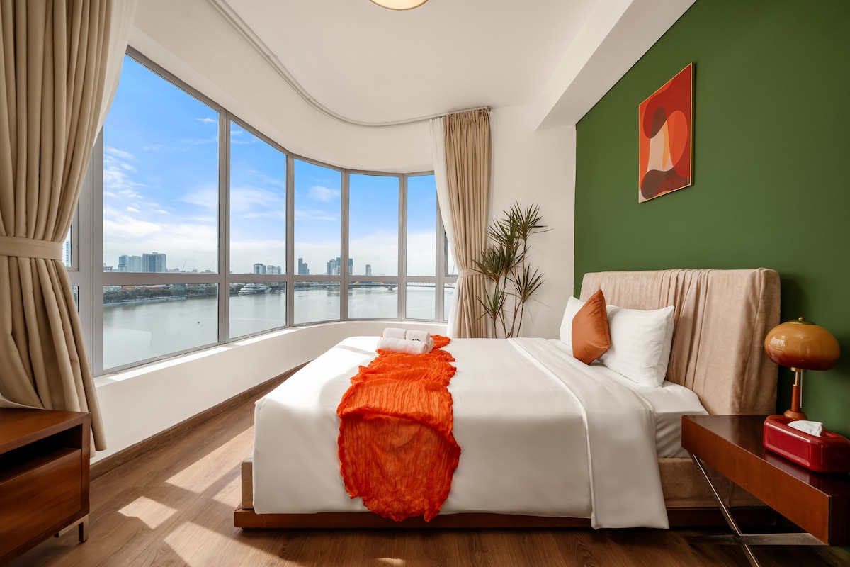 Հան գետի և Դանանգի խորհրդանշական կամուրջների տեսարանով այս ընդարձակ 110 մ² բնակարանը հանգստի հանգիստ վայր է քաղաքի վերևում։ Հյուրերը, որոնք գտնվում են աշխույժ Բախդանգ փողոցում, գետի հակառակ կողմում և Հան շուկայից ընդամենը մի քանի քայլ հեռավորության վրա, հանգստյան օրերին կարող են իրենց պատշգամբից վայելել Վիշապի կամրջի կրակի շոուն՝ ժամը 21:00-ին։ Ծովային կապույտ երանգներով և փայտյա հարդարանքի տաք երանգներով ձևավորված տունը հանգիստ և նրբաճաշակ տեսք ունի։ Ամենօրյա մաքրություն, անվճար լողավազան, մարզասրահ, սեղանի թենիս՝ իդեալական ընտանիքների, գործարար ուղևորների, երկարաժամկետ այցերի համար։