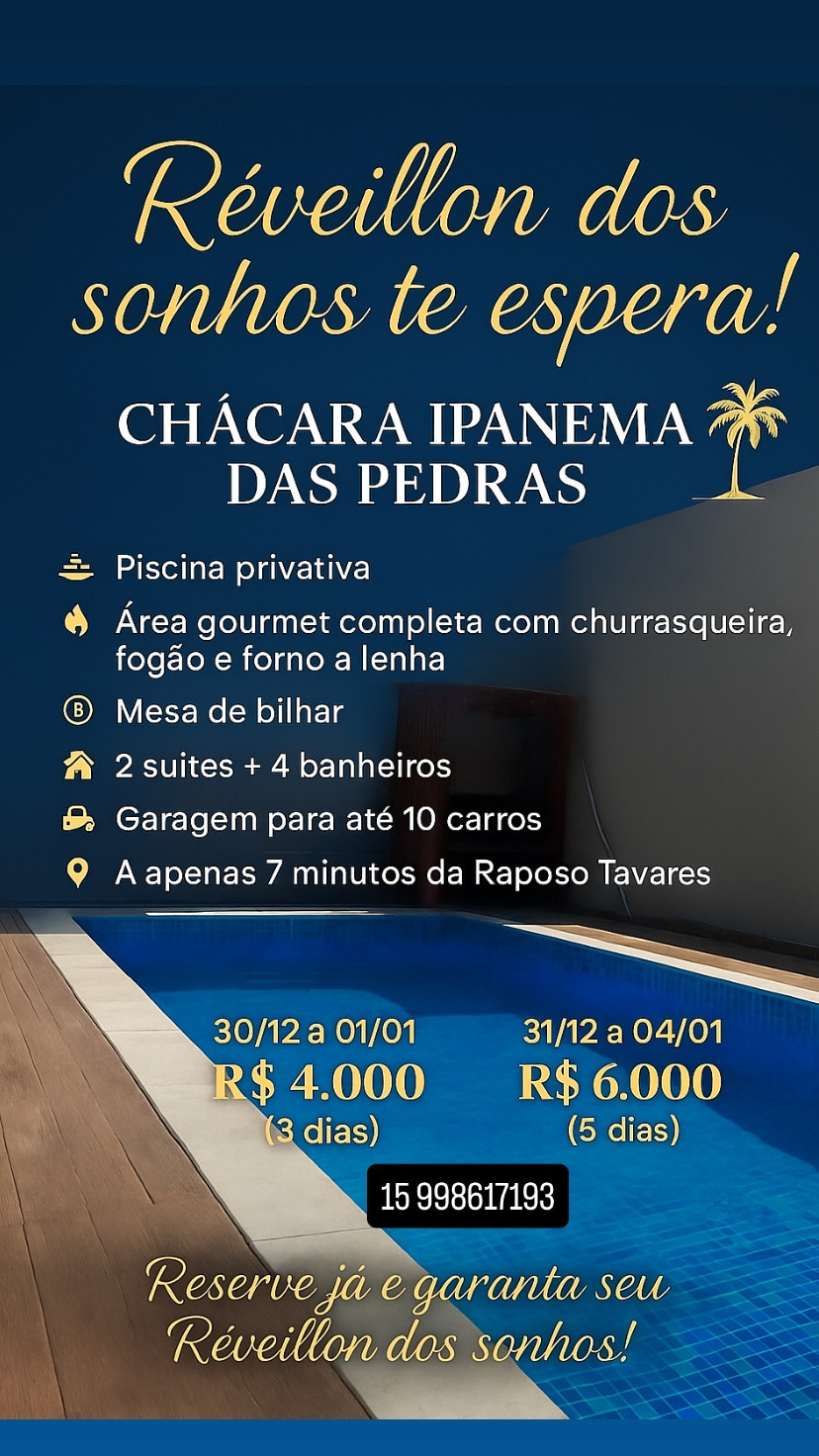 🏡✨ Chácara para Réveillon — Ipanema das Pedras ✨🏡 Quer começar o ano com conforto e diversão? Venha aproveitar dias incríveis nesta linda chácara, a apenas 7 minutos da Raposo Tavares! 💦 A casa conta com: • Piscina • Cozinha completa • 4 banheiros • 2 suítes (12 camas) • Área gourmet com mesa de bilhar, churrasqueira, fogão e forno a lenha • Garagem privativa para até 10 carros 📅 Pacotes disponíveis: • 31/12 a 01/01 → R$ 3.500 • 31/12 a 04/01 → R$ 5.000