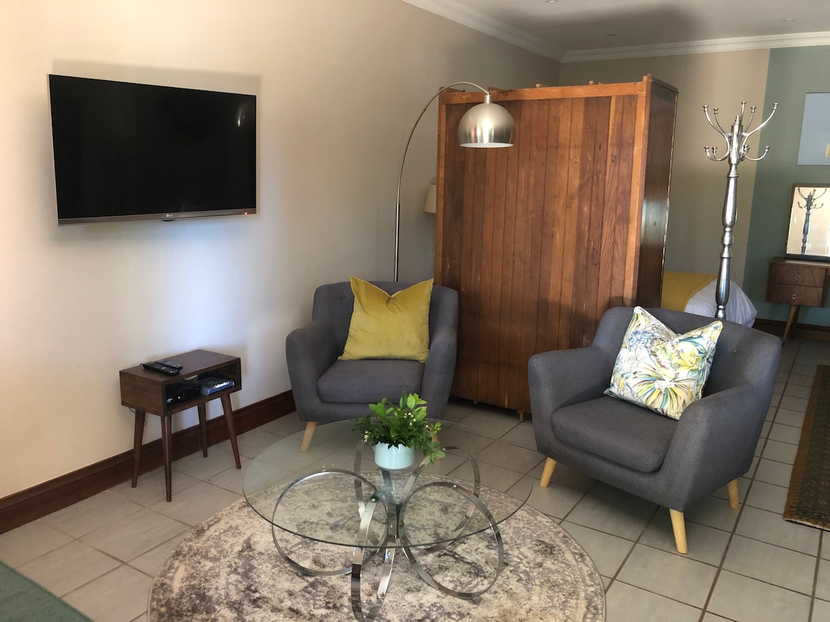 Beautiful studio apartment in a quiet area with built-in cupboards in the kitchen area. Enjoy the sirene forest garden with sounds of birds and have a typical South African style BBQ. Fully load-shedding friendly with solar and backup batteries. No electricity downtime.