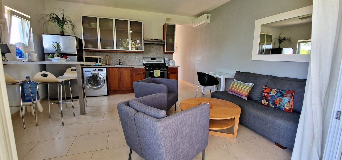 1 / 1 Stays 7 days or more will get free airport pickup, please message me. 1-bedroom private condo with a shared pool, laundry, and one parking space, walking distance to grocery, and minutes to town and beaches. The home features a workstation that is ideal for remote work, while the balcony offers comfortable seating..The kitchen comes equipped with everything you need to cook and the living room offers a smart TV. Two A/Cs. Electric is not included guests get $15 credit for trips 2-5 days