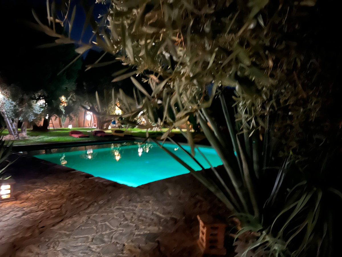 Superbe villa avec piscine au cœur d'une palmeraie. Elle se compose d'une grande pièce à vivre avec salon salle à manger et cuisine ouverte vue sur la piscine et la palmeraie, une chambre d'enfants avec un lit de 70 cm x 160cm, une grande chambre parentale avec un lit King size, une salle d'eau avec WC et douche à l'italienne. Une dépendance avec un lit de 140 cm et une salle d'eau avec WC et douche. Un pool housse comprenant une cuisine et une salle à manger d'extérieur. Pas de climatisation.