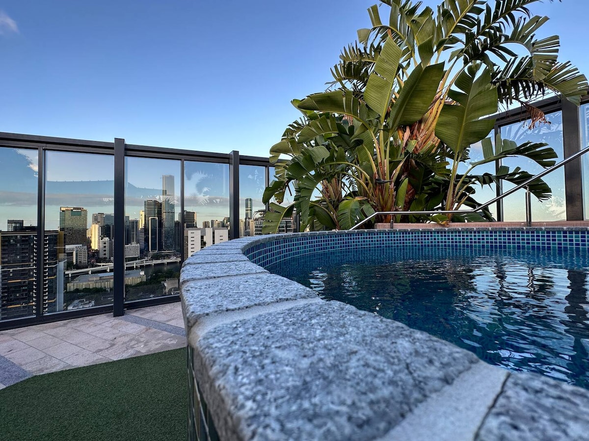 Բարի գալուստ ձեր քաղաքային օազիս ։ Այս ստուդիայում կա տանիքի մասնավոր պարտեզի տեռաս ՝ մայրցամաքային տեսարաններով ։ Վայելեք բացօթյա դիզայնը ՝ հատակից մինչև առաստաղը ձգվող պատուհաններով, խոհանոցիկով, ճաշասենյակով, լաունջով և ննջասենյակով ։ Կատարյալ է աշխատանքի կամ հանգստի, յոգայի կամ փոքր հավաքույթների համար ։ Ունի ուսումնական սեղան և մեծ ճաշասեղան ։ Իդեալական վայր է Southbank - ում, The Gabba - ում, QPAC - ում, Riverstage - ում, Suncorp Stadium - ում և Կոնվենցիայի կենտրոնում: Ներառում է 55դյույմանոց սմարթ հեռուստացույց + անվճար Netflix և մեքենայի անվճար կայանատեղի ։ Կատարյալ հանգիստ քաղաքում ։