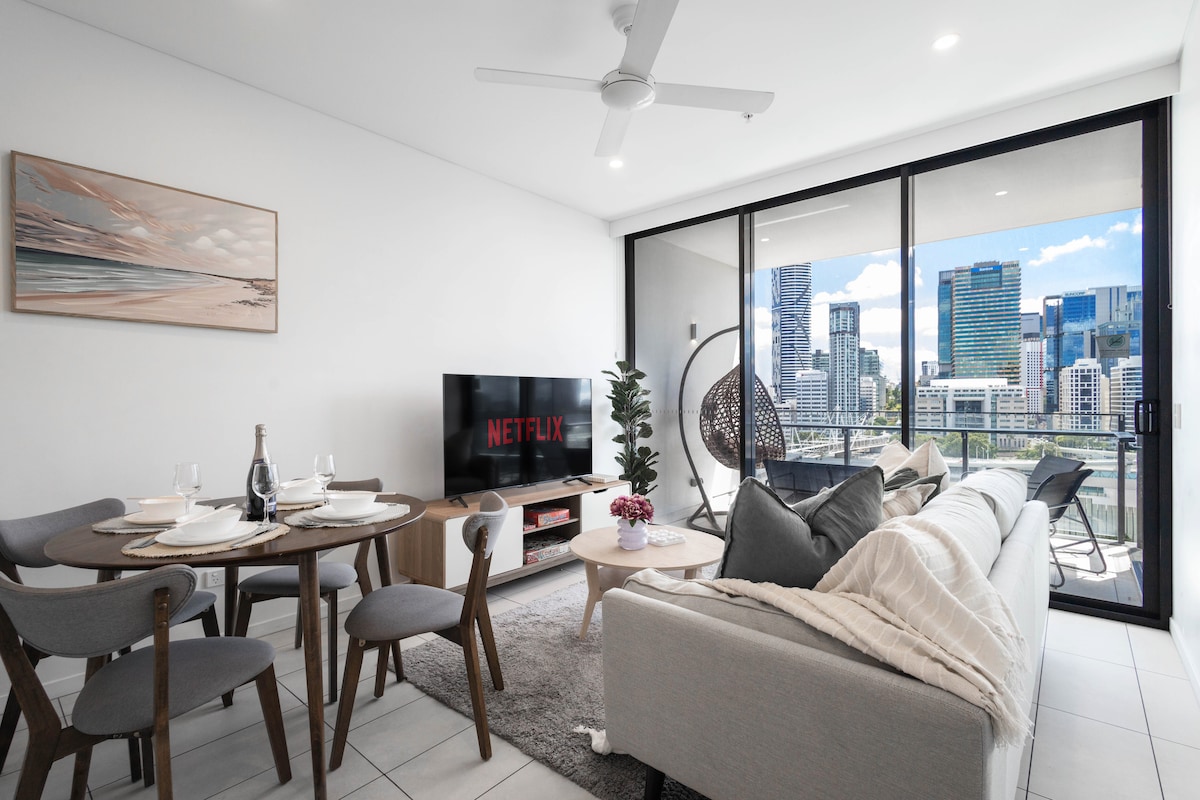 Find your calm in this Diamond-Class 1BR retreat on Level 59 of Queen’s Wharf. Enjoy sweeping river & city views, a breezy electric window, modern interiors and high-speed Wi-Fi—just steps from South Bank, Botanic Gardens and Brisbane’s finest dining. Ideal for couples, corporates and weekend escapes. ✔ No Added Cleaning Fee ✔ King Bedroom & Sofa Bed (Sleeps 4) ✔ Full Kitchen & Open Living ✔ Indoor Electric Balcony Window ✔ Smart TV & Wi-Fi ✔ Pool, Gym, Sauna & Restaurants Learn more below 👇