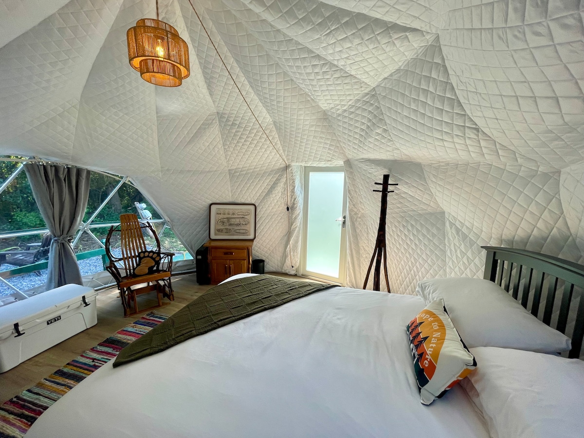 Ողջունեք Shady Oaks-ի առաջին գլեմփինգ վրանը՝ The Buckminster-ը։ Բակմինստեր Ֆուլլերի ոգեշնչմամբ ստեղծված այս հարմարավետ հանգստավայրը միաձուլում է բացօթյա արկածները իրական հարմարավետության հետ։ Քնեք աստղերի տակ, արթնացեք թարմ առավոտյան օդի ներքո և վայելեք իսկական մահճակալը՝ մտածված մանրամասներով։ Սա քեմփինգ է այն մարդկանց համար, ովքեր սիրում են խարույկներ և սմորներ, բայց նաև գնահատում են ներքնակը։ Գյուղական հմայք՝ արդիականացված տարբերակով։