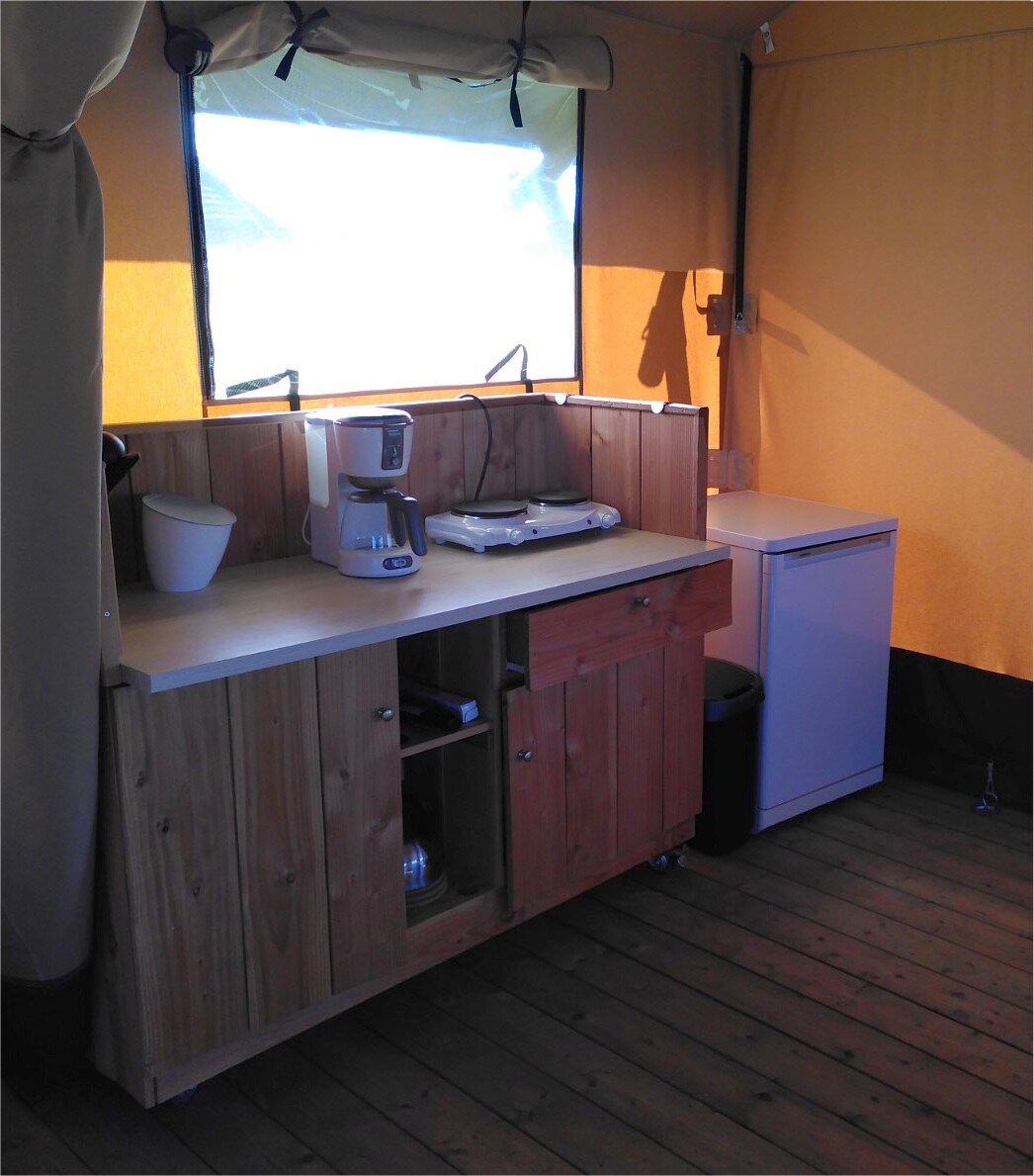 Experience the ultimate outdoor living experience in complete comfort in our brand-new Bell Tent! Enjoy a carefree holiday in a fully furnished tent with a comfortable bed, luxurious mattresses, and down duvets. Cook in your own fully equipped kitchen, start the day with coffee from the percolator, and warm up by the wood-burning stove in the evening. Relax in comfortable chairs, indoors or outdoors, with electricity. The tranquility of nature, with the comforts of home.
