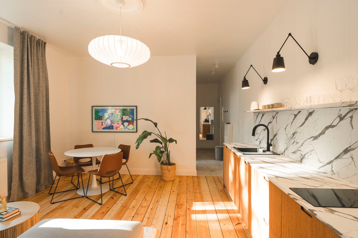 Նոր վերանորոգված 2 սենյականոց բնակարան ՝ - սպիտակ ավազոտ լողափից 500 մ հեռավորության վրա, - Ծովափնյա զբոսայգուց և վազքի/հեծանվավազքի արահետից 100 մ հեռավորության վրա (5 կմ երկարությամբ), - թենիսի կորտերից 300 մ հեռավորության վրա, - Լատվիայի ամենամեծ մանկական խաղահրապարակներից մեկից 500 մ հեռավորության վրա, - Բոուլինգի կենտրոնից 400 մ հեռավորության վրա, որտեղ կարող եք զվարճանալ նաև անձրևոտ օրերին :) Բնակարանն ինքնին նույնքան հմայիչ է, որքան շրջակայքը, այն օրիգինալ փայտե հատակ է, բարձր առաստաղներ և այլ մանրակրկիտ ընտրված մանրամասներ կստիպեն ձեզ զգալ ինչպես տանը: