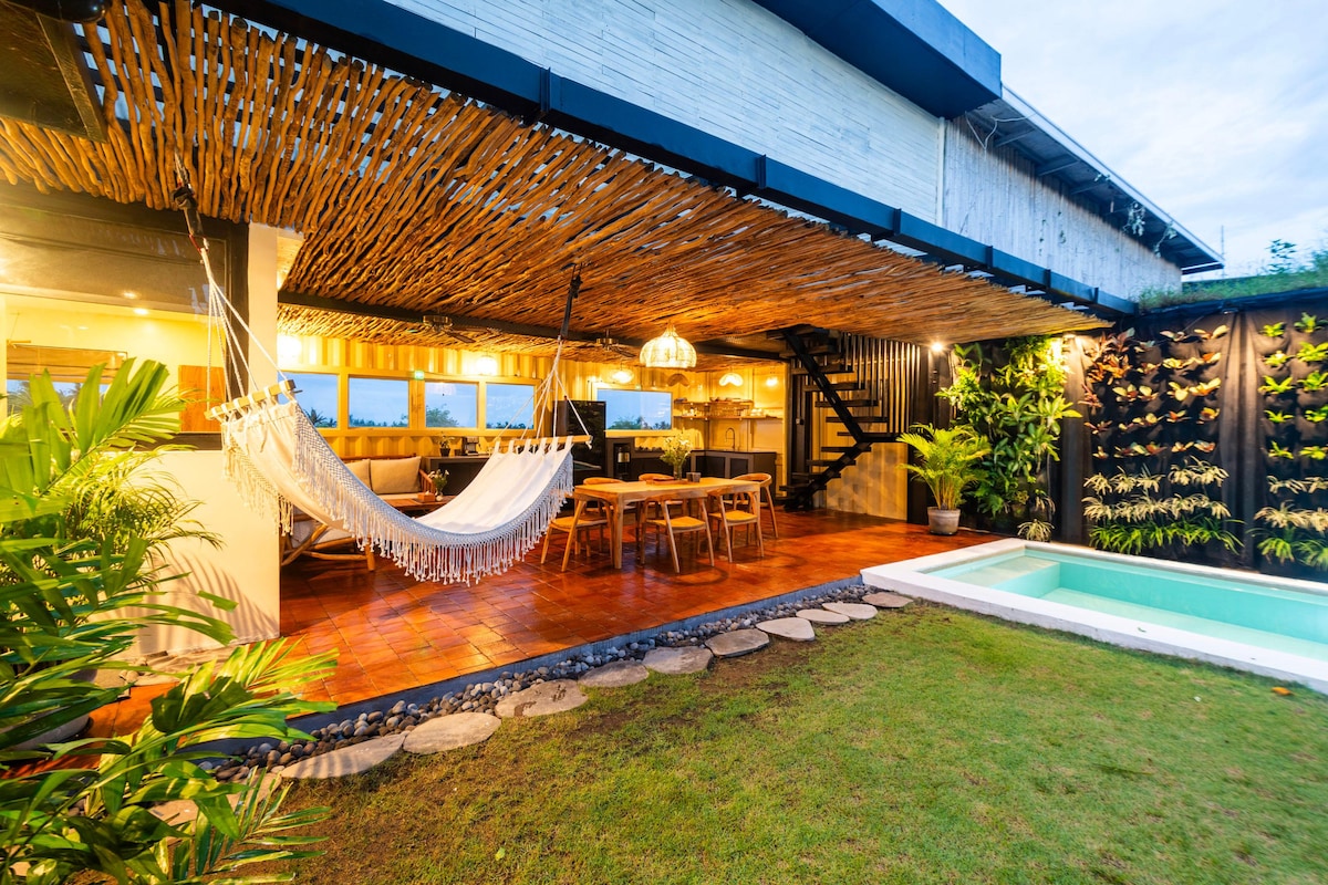 Agréement touristique PMA / KBLI 55900 Ecolodge de 2024 avec cuisine équipée et piscine privative dans un joli jardin. Avec sa toiture en alang - alang , sa salle de bain semie-ouverte , sa kitchenette independante, sa piscine et son filet de repos, le lodge offre des espaces ouverts sur le jardin tropical en toute privacy avec une decoration boheme qui vous plongera de suite dans lesprit de Bali. Situé à 5mn de Bingin Beach, Dreamland et Uluwatu center. Petit déjeuner a la carte inclus 👍