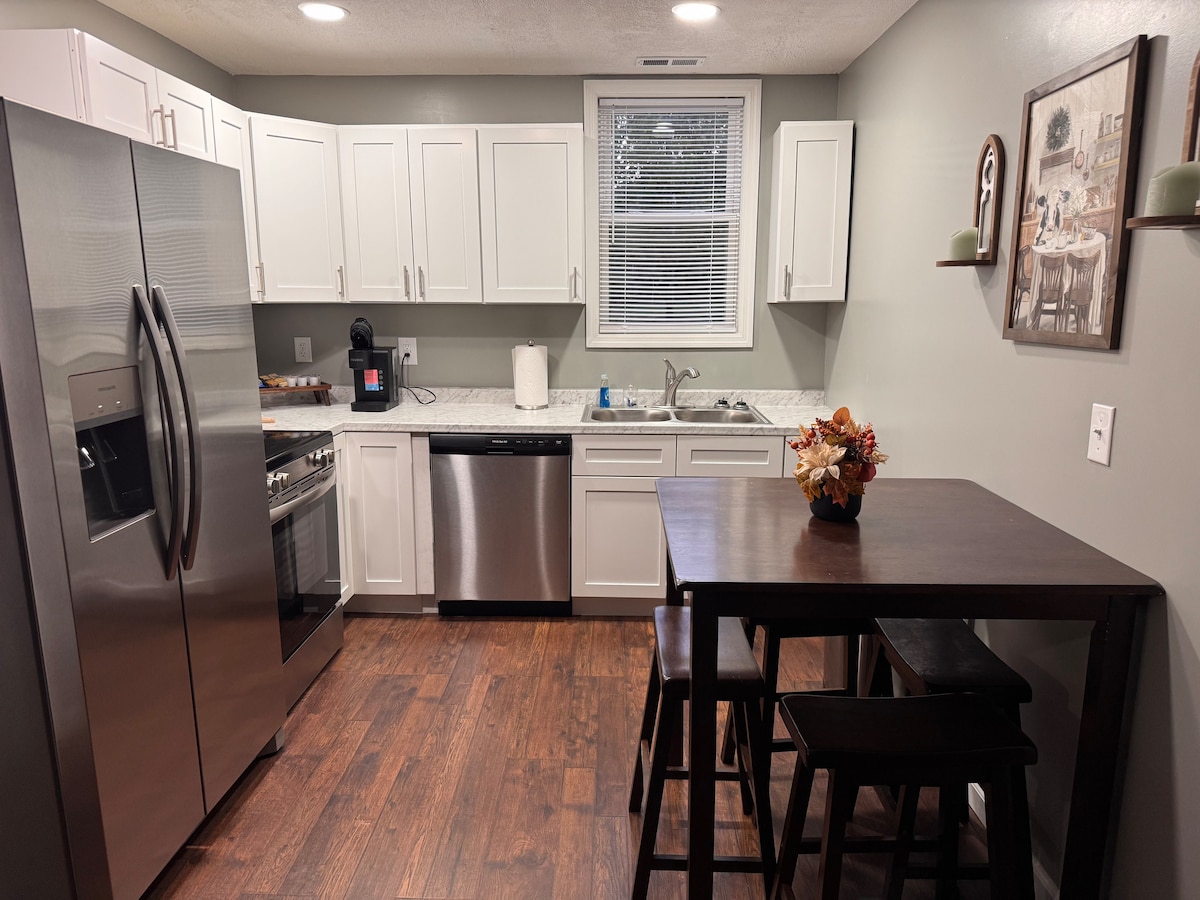 Our loft has a separate entrance and private parking. We’ve created a cozy, elegant atmosphere with luxury bedding, LED fireplace, full internet connection, heat/air, and a fully stocked kitchen with all the pots, pans, dishes, and silverware you'll need. The Kitchen features a full-sized gas range, air fryer, full size refrigerator, microwave, and a coffee maker with K-cup and a coffee pot.
