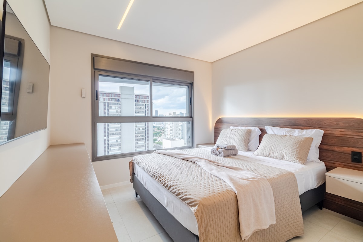 Estúdio espaçoso com muito design, arquitetura e a melhor vista de São Paulo. Loft completo! Com cama queen, closet, ar condicionado silencioso, cozinha completa, home office, WI-FI, TV 55” e uma belíssima banheira de imersão, de onde pode apreciar o seu drink preferido e curtir uma vista apaixonante. São Paulo toda estará há poucos minutos de você. Acesse o metrô andando apenas 200m. Reserve com tranquilidade! Proporcionaremos uma excelente hospedagem e uma ótima experiência!