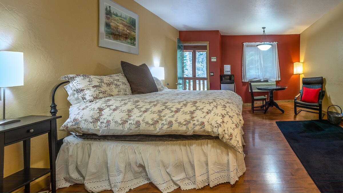 Housed in the main lodge of the Green Springs Inn and Cabins, this second floor private room will make you feel right at home. Complete with a king-sized bed and in-room jacuzzi, you can relax and unwind in PNW style. Additional amenities include a mini-fridge, microwave, and coffee maker for simple meal prep. Step outside and find yourself suddenly immersed in the natural wonderland of Cascade Siskiyou National Monument.
