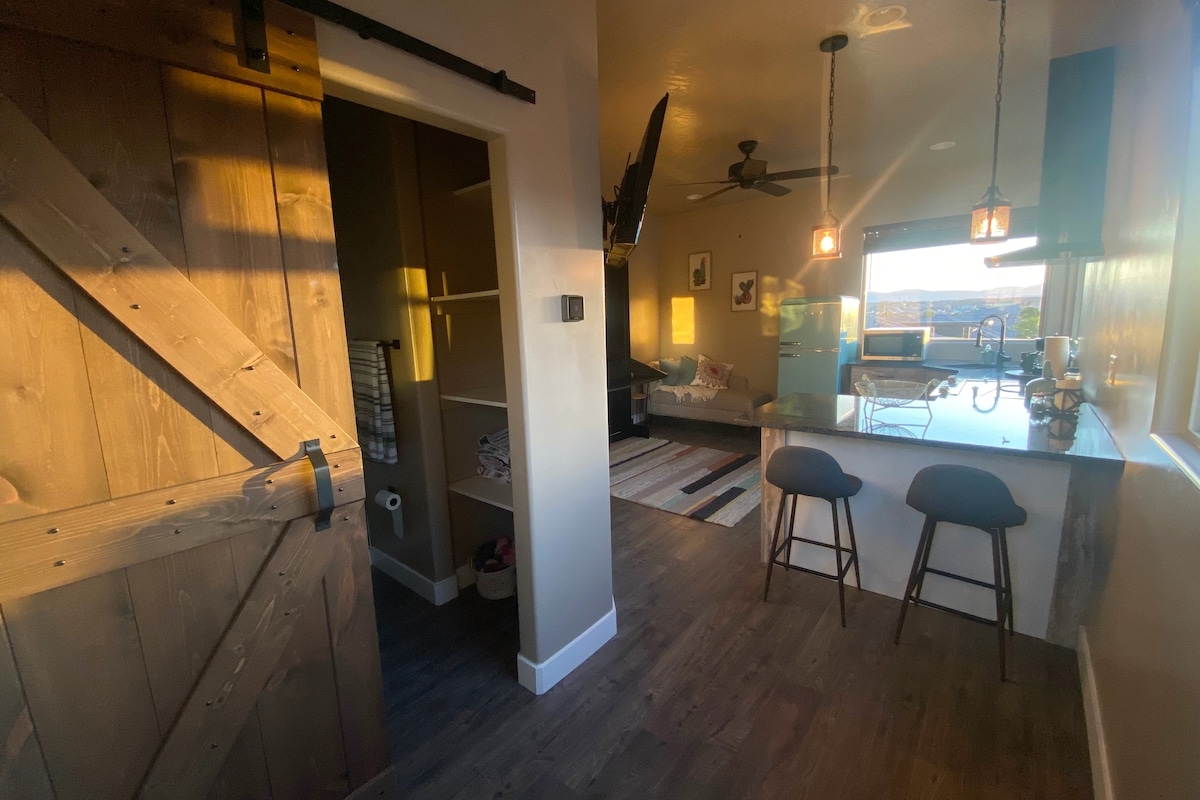 Experience the ultimate Zion escape! Perched atop a unique basalt cliff, this custom casita offers breathtaking panoramas of the Virgin River, a volcanic gorge, and the Pine Valley Mountains. Bordering protected lands, it’s a haven for local wildlife and your perfect desert oasis for a red rock adventure! Located 23 miles from Zion National Park and less than a mile from Zion Hot Springs, you have world-class hiking and soaking at your fingertips.
