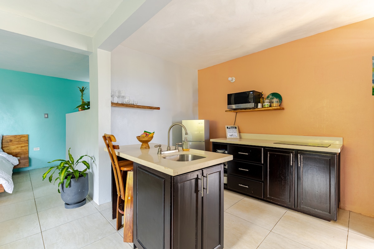 Located on a slight elevation, your balcony has a beautiful view of the Caribbean Sea. Our home is an affordable villa that sleeps 4, with a King size bed in a private bedroom and two twin beds in a semi private area. Open living/kitchen and wet bar style eating area. Perfect enclosed balcony area with seating and super comfy bamboo hammock.