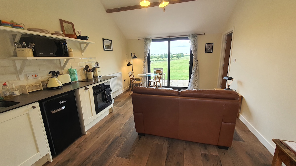 The Stable Studios are the recently renovated wooden stables of The Stable House, a family home converted in 1970 from a Victorian stable block. There are three studios; each studio has a spacious double bedroom with ensuite walk-in shower room, a separate living room with kitchen facilities including oven, hob, microwave and fridge and sliding doors out onto your own patio with wonderful open views over the local countryside and access to over 20 acres of parkland, paddocks and woodland