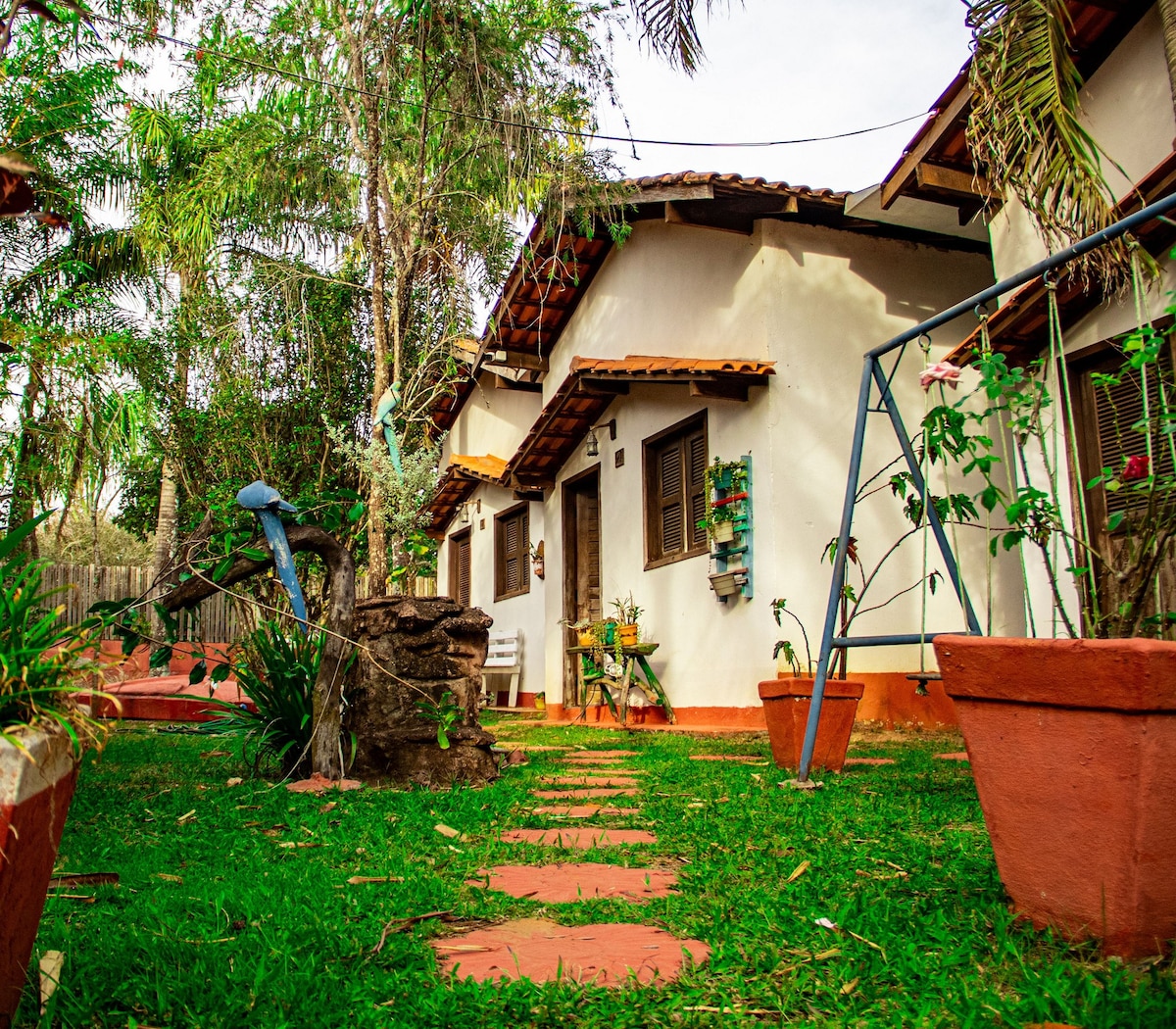 Ambiente foi criado e inspirado para que o casal tenha sossego, intimidade e aproveite o melhor da vista que o nosso jardim consegue oferecer. acolhedor e intimista, todas as estações oferecem seu charme e carinho com nossas visitas. Comodidades: Café da Manhã Cama Queen e Ar Condicionado Banheiro com Itens de Higiene Pessoal Frigobar Sala com TV Smart: Netflix e YouTube