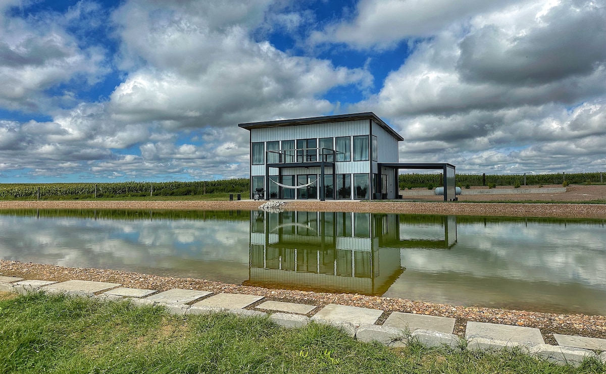 Welcome to our charming boho-inspired Grain Bin Cabin, the Highland is ideal for 2-3 adults or 2 adults and 2 smaller children. Upstairs, you'll find a comfortable king bed in the loft, while downstairs features a cozy futon in the main living space. The full kitchen is equipped with everything you need. Full Bath with a walk-in shower downstairs. Experience a serene countryside getaway with breathtaking sunsets and peaceful surroundings, just moments away from Versailles.