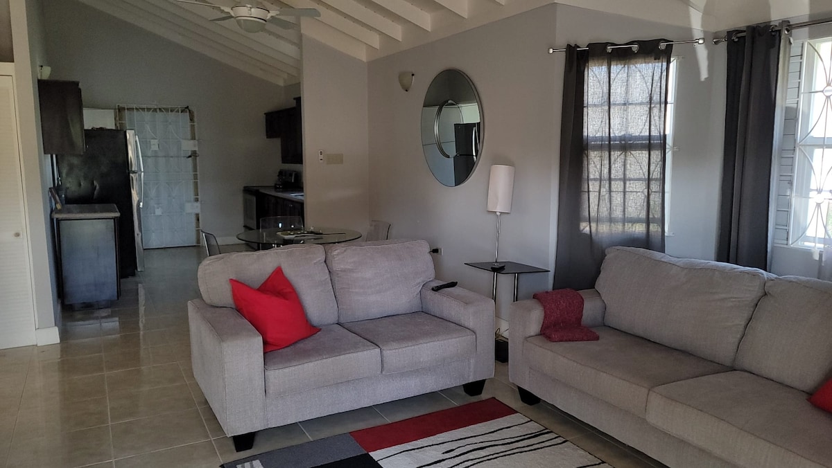Unwind at this peaceful Jamaican garden oasis An entire private 1 bedroom unit in the upper level of a large home. Spacious tiled floors throughout, with upper private balcony/patio and separate entrance. You will be welcomed and cared for by the owner who can assist with other services if needed ‘ON REQUEST’. Such as airport pick up/drop off, EXTRA. We are happy to provide essentials, soap, shampoo, fresh linen/towels, tea coffee, spices, and complimentary continental breakfast supplies.