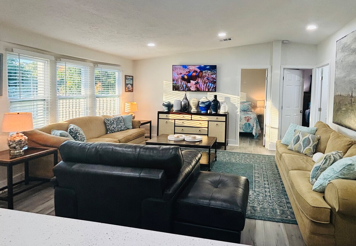 NO CLEANING FEE Suite has 3 rooms with the front door as your private entrance. Queen size bed,50 inch smart t.v.,small kitchen and combined sitting area and full private bath. The stocked kitchenette has coffee, dishes, silverware, napkins, paper towels, disinfectant wipes(if needed) microwave, fridge. There is a small leather loveseat and worktable. Free coffee/hot tea/snacks/cold drinks Separate work area Private entrance All cotton sheets Comfortable bed Quiet, non smoking property