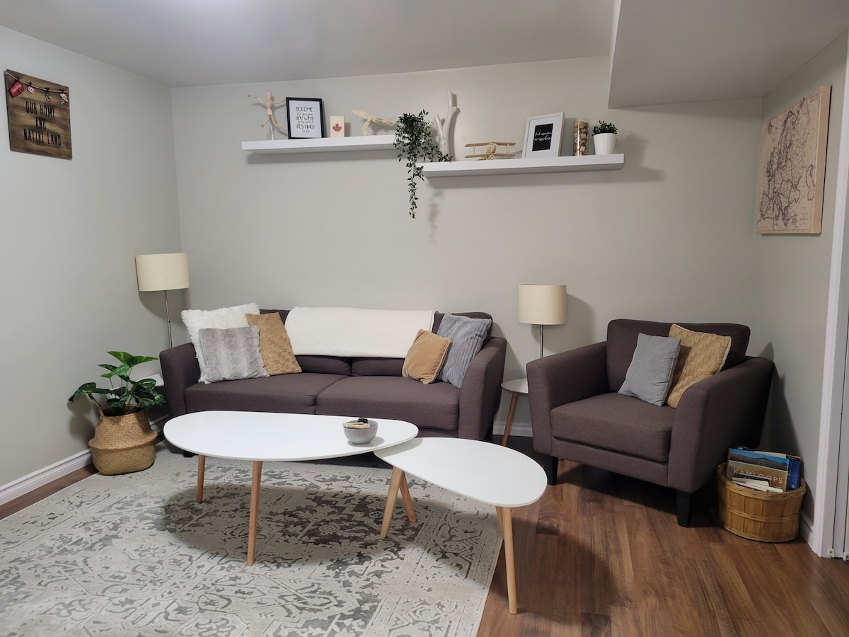 Բարի գալուստ այս բոլորովին նոր մասնավոր հյուրերի առանձնաբաժին ՝ ցերեկային մեծ պատուհաններով և առանձին մուտքով ։ Անկախ նրանից, թե դուք գտնվում եք քաղաքում, այցելում եք ընտանիք, կարճաժամկետ աշխատանք կամ վայելում եք այն բոլոր գործողությունները, որոնք առաջարկում է Kamloops - ը (Sun Peaks լեռնադահուկային սպորտ, լեռնային հեծանվավազք և այլն), այս հավաքակազմը ձեզ տրամադրում է ողջունելի հանգիստ ՝ ամեն ինչ ինքնուրույն վայելելու համար: Կամլոոպսի նորագույն թաղամասերից մեկում կա լիովին կահավորված խոհանոց (այդ թվում ՝ Nespresso սուրճ և Tazo թեյ), արագ Wi - Fi և ավտոկայանատեղի: